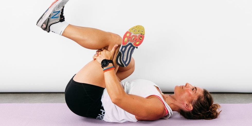 Lie on your back, cross one ankle over the opposite knee. Hold the uncrossed leg and pull gently towards your chest.